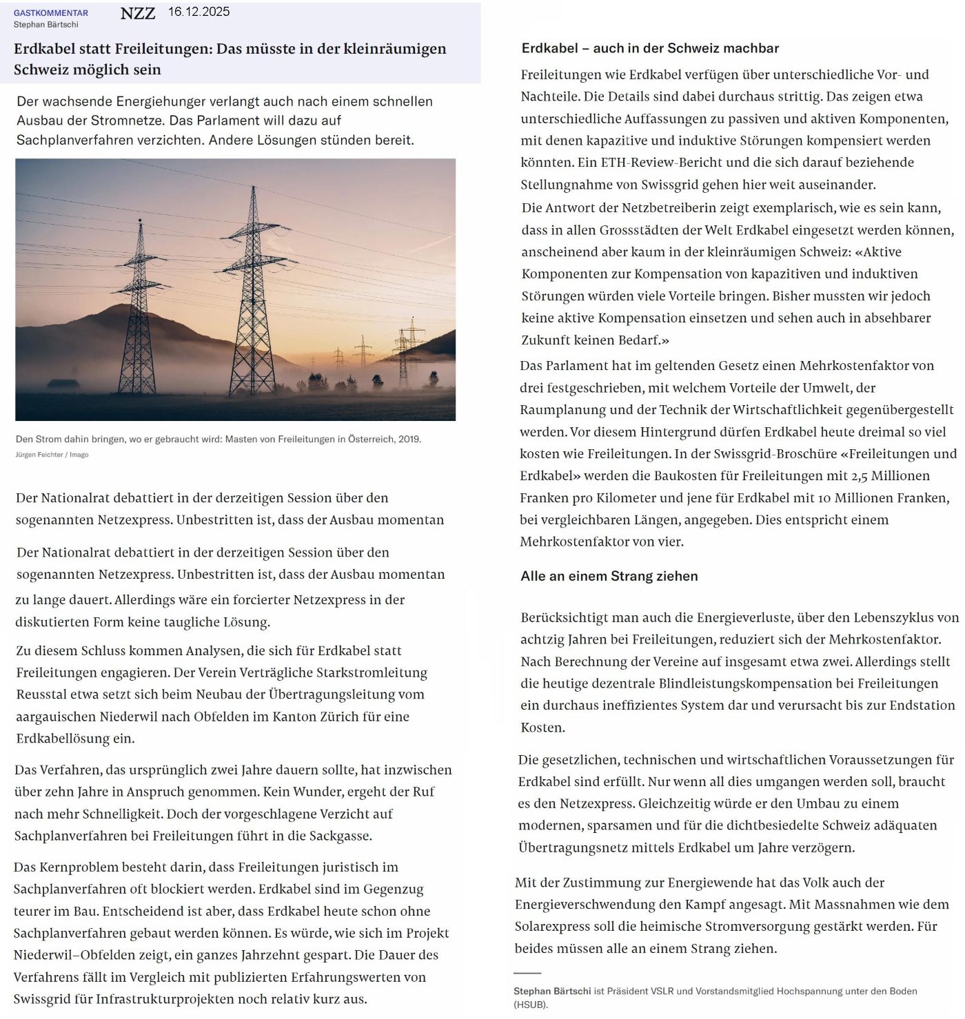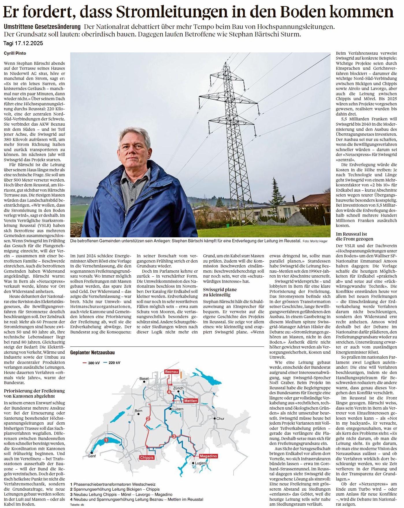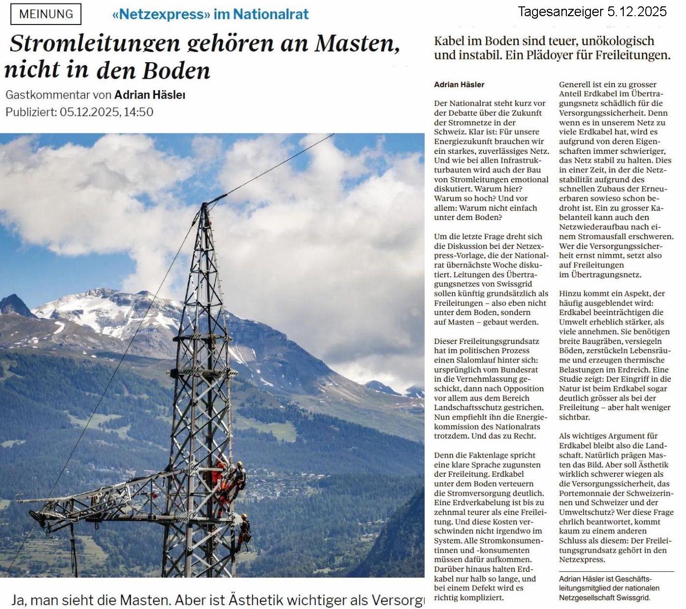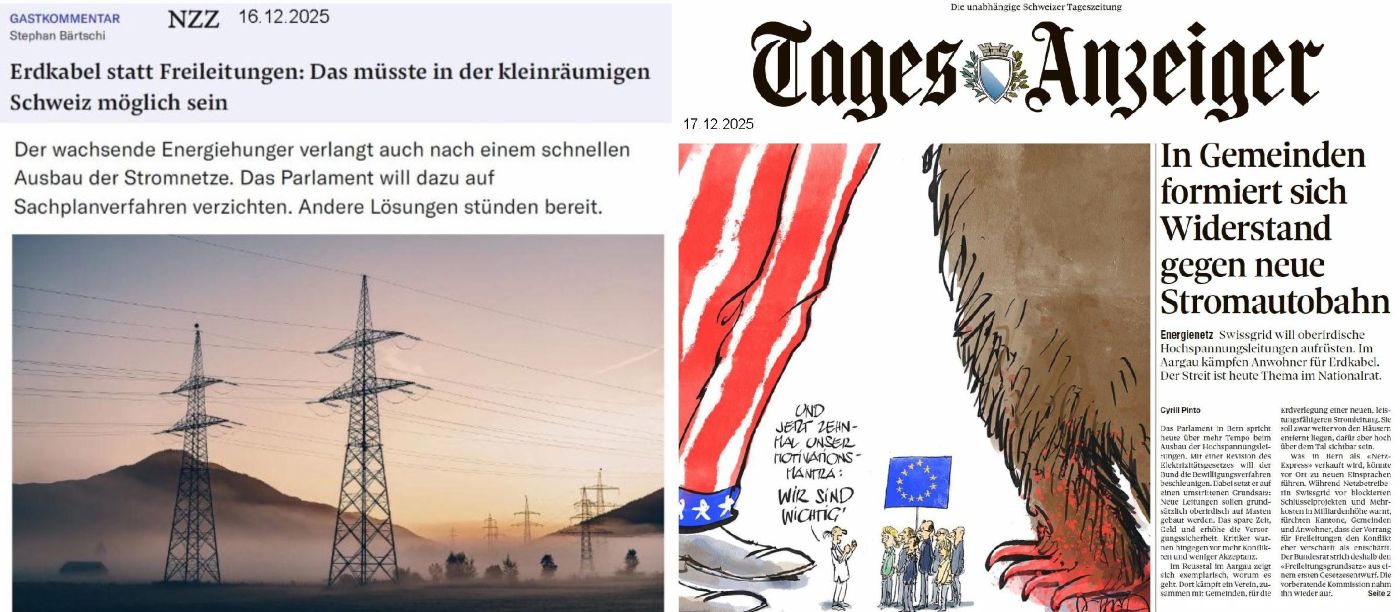 Der Nationalrat hat am 18.12.2025 die Änderung des Elektrizitätsgesetzes beschlossen. Abgelehnt wurde die Minderheitsproposition Amoos (Art15B) Abstimmungsergebnis: Ja: 112, Nein: 69, Enthaltungen: 12. Damit wird am Freileitungsgrundsatz festgehalten. Im Januar 2026 wird der Ständerat noch darüber debatieren. SF1-Tagesschau ![]()